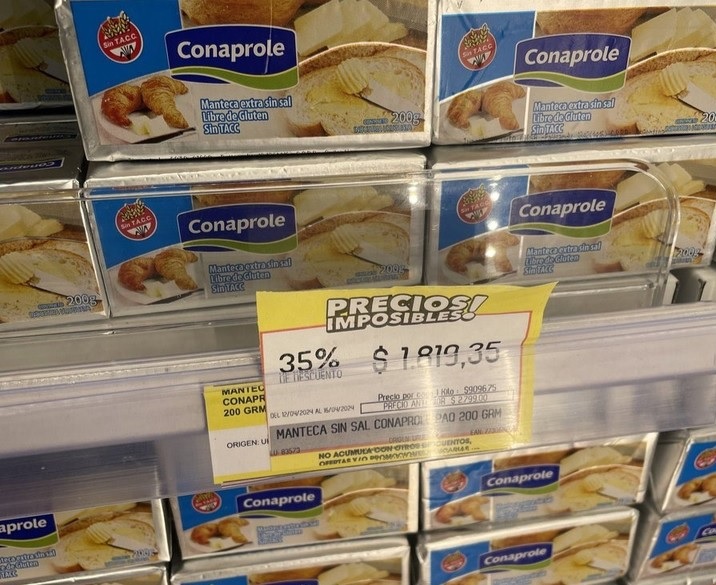Más allá de la estrategia general, cada súper tiene sus negociaciones. En uno, ya se encuentra la marca uruguaya Conaprole. Vende el pan de manteca (con y sin sal) de 200 gramos, el queso untable (tradicional y light) de 250, el frasco de 440 de dulce de leche y el cartón de crema de leche de 250. La manteca está a un precio similar que la misma de La Serenísima: $ 2.799 versus $ 2.681. En el caso de la crema, el litro sale $ 10.396 comparado a $ 9.460 del de La Serenísima.