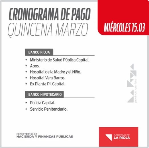El Gobierno de La Rioja informó el cronograma de pago correspondiente a la quincena de marzo para trabajadoras y trabajadores de la administración pública provincial.AUMENTO EN LOS PASAJES AL INTERIOR DE LA PROVINCIA
