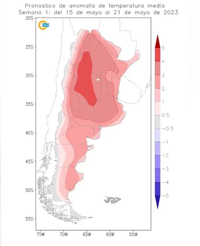 La cuenta oficial del Servicio Meteorológico Nacional, en su cuenta de Twitter mostró la irregularidad que presenta la temperatura este mes: “¿Te estás preguntando cómo será esta semana? ¡Este gráfico lo revela! Muestra la anomalía de temperatura media entre el 15 y el 21 de mayo.