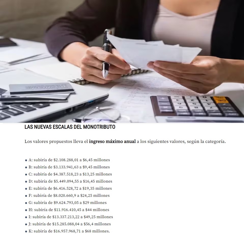 De aprobarse el proyecto al que apuesta fuerte el Gobierno, los monotributistas con menores ingresos inscriptos en la categoría A podrán facturar hasta $6.450.000 de forma anual, en tanto que los que están en la categoría K, la más alta, pasarán 68 millones de pesos.