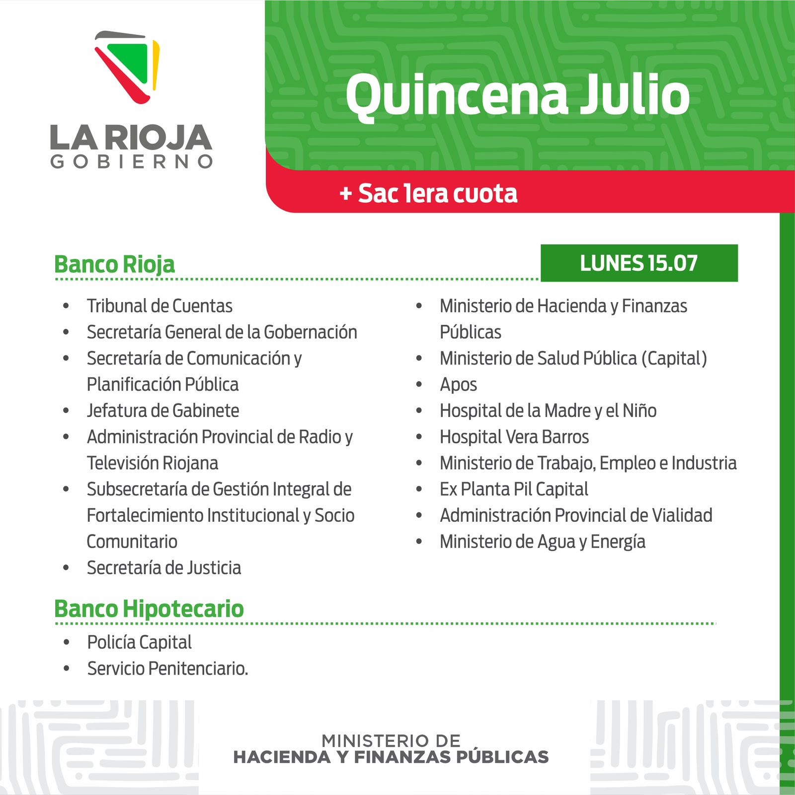 El gobierno de La Rioja, mediante el ministerio de Hacienda y Finanzas informó que este lunes 15 de julio comenzará a abonarse la quincenita, junto a la primera cuota anual del Aguinaldo, para los empleados de la administración pública.