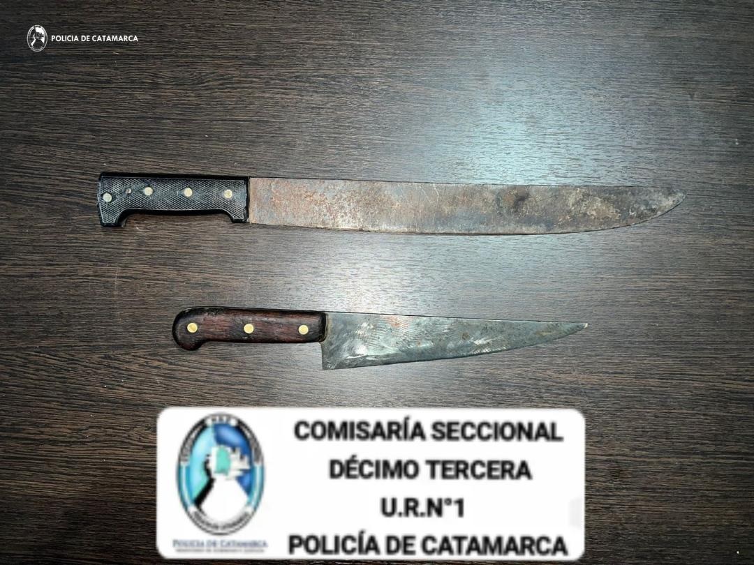 Inmediatamente, los uniformados realizaron recorridos de prevención por la zona y en la intersección de las calles Maipú y Flor de Cerezo, aprehendieron a una jovencita de apellido Bustamante (20) y a un joven de apellido Acosta (23), quienes serían los presuntos autores del hecho, como así también secuestraron las armas blancas.
