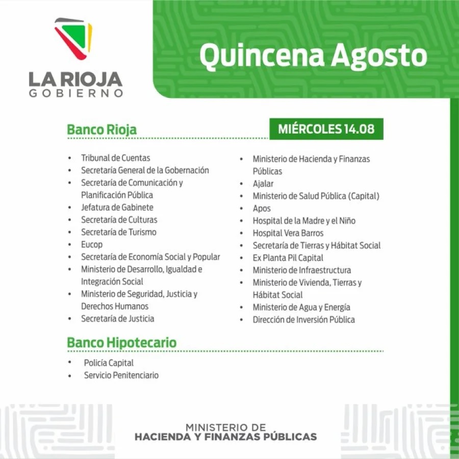 A través del ministerio de Hacienda, el gobierno de La Rioja informó que este miércoles 14 de agosto comenzará el cronograma de pago de la quincenita.