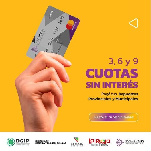 PROMOCIÓN VÁLIDA ÚNICAMENTE PARA CLIENTES CON TARJETAS DE CRÉDITO MASTERCARD EMITIDAS POR EL BANCO RIOJA S.A.U, LA VIGENCIA SERÁ TODOS LOS DÍAS A PARTIR DEL 10/10/2024, HASTA EL 31/12/2024 INCLUSIVE; PARTICIPAN TODAS LAS COMPRAS QUE SEAN ABONADAS EN CUALQUIERA DE LOS LOCALES ADHERIDOS A LA PROMOCION “PAGÁ TUS IMPUESTOS PROVINCIALES EN CUOTAS SIN INTERÉS” BAJO EL/LOS RUBRO/S DE, SERVICIOS DE EXPENDIO DE: COBRO IMPUESTOS PROVINCIALES. SIENDO LOS TIPOS DE ESTABLECIMIENTOS DETALLADOS DE MODO DE REFERENCIA Y NO EXCLUYENTE DE SERVICIOS AFINES SOBRE EL IMPORTE NETO DE LA COMPRA, MÁS 1- 3 – 6 Y 9 CUOTAS SIN INTERÉS, SIN TOPE DE REINTEGRO. LA EFECTIVIZACIÓN TOTAL DEL AHORRO SERÁ EFECTUADA VÍA REINTEGRO EN LA LIQUIDACIÓN RESPECTIVA. (1) PARA 1 CUOTA SIN INTERÉS TNA (TASA NOMINAL ANUAL) 0,00% TEA (TASA EFECTIVA ANUAL) 0,00% (2) PARA 3 CUOTAS SIN INTERÉS: TNA: 0,00%, TEA: 0,00%, CFTEA: 0,00%. (3) PARA 6 CUOTAS SIN INTERÉS: TNA: 0,00%, TEA: 0,00%, CFTEA: 0,00%. (4) PARA 9 CUOTAS SIN INTERÉS: TNA: 0,00%, TEA: 0,00%, CFTEA: 0,00%. CONFORME RES 240-E/2017 Y RES 51-E/2017 DE LA SECRETARIA DE COMERCIO DE LA NACIÓN. LOS DATOS INCLUIDOS EN ESTE REVISTEN CARÁCTER EXCLUSIVAMENTE INFORMATIVO Y EN MODO ALGUNO SUPONEN QUE LOS ESTABLECIMIENTOS, PRODUCTOS O LA CALIDAD DE LOS MISMOS SE ENCUENTRAN PROMOCIONADOS Y/O GARANTIZADOS POR EL BANCO RIOJA S.A.U. QUEDAN EXCLUIDAS LAS CUENTAS EN MORA Y/O BLOQUEADAS POR MOTIVOS ADMINISTRATIVOS. LOS COMERCIOS ADHERIDOS ESTÁN PUBLICADOS EN www.bancorioja.com.ar/beneficios. PROMOCIÓN NO ACUMULABLE CON OTRAS PROMOCIONES VIGENTES. EN CASO DE CONCURRENCIA DE PROMOCIONES EN UN MISMO DÍA, SE APLICAN EN EL SIGUIENTE ORDEN, EXCLUYENDO A LAS OTRAS: 1. CAMPAÑA “TE BANCO MÁS”; 2. CAMPAÑA “TE SUPER BANCO”; 3. CAMPAÑA “SENTITE LIBRE”. EL CLIENTE DEBE VERIFICAR AL MOMENTO DE REALIZAR LA COMPRA, QUE LA TRANSACCIÓN SE REALICE EN TERMINALES DE CAPTURA POSNET/CLOVER PROCESADA POR FISERV, NO SIENDO VÁLIDA Y/O CONSIDERADAS SI DICHA OPERACIÓN ES REALIZADA POR OTROS DISPOSITIVOS ADMINISTRADOS POR OTROS PROVEEDORES, QUEDANDO LA ENTIDAD EXIMIDA DE RESPONSABILIDAD EN EL CASO DE ALGÚN RECLAMO POR PARTE DEL CLIENTE. PROMOCIÓN VÁLIDA ÚNICAMENTE PARA LA PROVINCIA DE LA RIOJA.