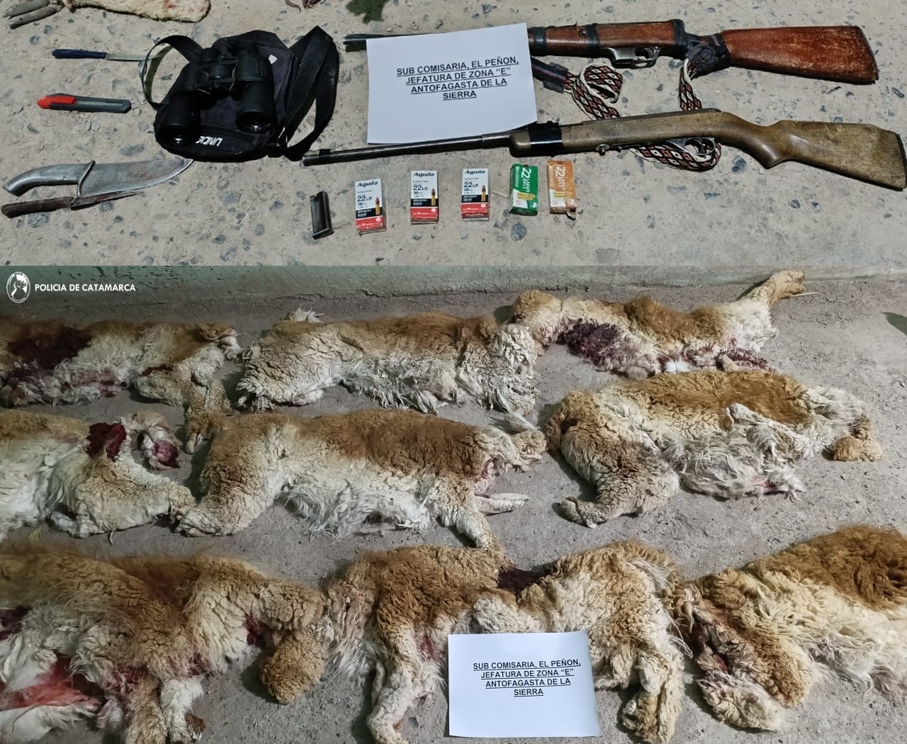 Anoche, a las 21:50, un efectivo de la Subcomisaria de El Peñón, observo una camioneta Toyota Hilux en actitud sospechosa y al controlarla, constató que se conducian siete personas mayores y menores de edad. Al inspeccionar el rodado, observó que en la caja llevaba once (11) cueros de vicuña, producto de una caza furtiva, siete (07) animales faenados, dos (02) rifles calibre 22 con 153 cartuchos, un (01) binocular y elementos de faena, que quedaron en calidad.