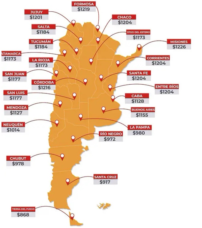 Hacia el sur del país se encuentran las jurisdicciones con los precios más bajos. La más económica es Tierra del Fuego, donde el valor del litro de nafta es de $868. También por debajo de $1.000 figuran Santa Cruz ($917), Río Negro ($972), Chubut ($978) y La Pampa ($980).