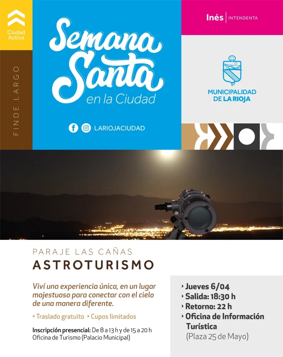 La Municipalidad de La Rioja ofrece una variedad de propuestas para realizar este fin de semana largo, algunas conocidas y otras novedosas como el astroturismo, una experiencia única y diferente contemplando el cielo y las estrellas en el Paraje Las Cañas. La salida será el jueves 6 de abril a las 18.30 horas desde la Oficina de Información Turística de la Plaza 25 de Mayo. El traslado es gratuito y los cupos limitados.