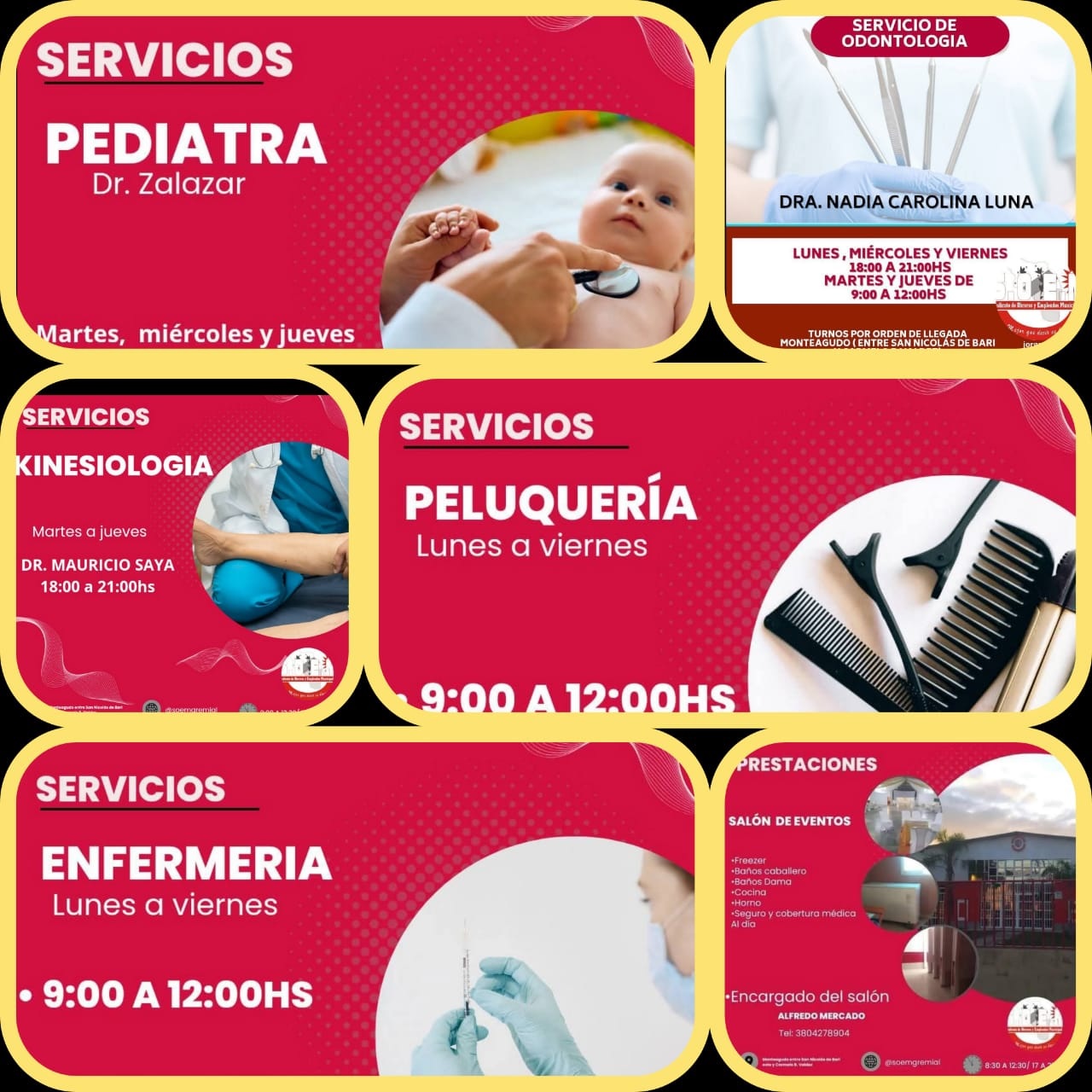 los servicios son pediatría, odontología, kinesiología, enfermería, peluquería, asesoramiento legal, cómo así también tenemos el servicio de salón de fiesta y camping.