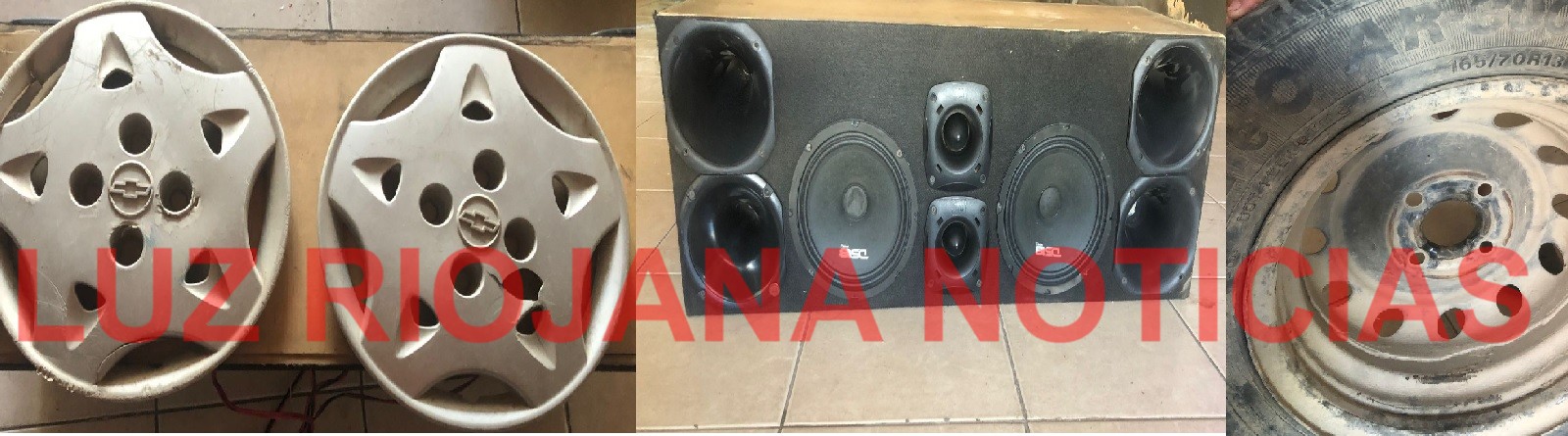Inmediatamente personal policial de Sub. Comisaria Anguinan y con la colaboración de la unidad móvil de la División de Accidente Viales, se dirigen al domicilio del joven Angel Narvaez Vera de 23 años de edad, con domicilio en el barrio Bº Alto Valle de la ciudad de Chilecito, donde se presenta la madre del joven, quien entrega voluntaria de los elementos robados, los cuales son, una caja de sonido de material madera, forrada en su frente con tela color negra, compuesta para dos parlantes denominados medios de la marca DS18, como asi también 4 cuatro bocinas y 2 dos parlantes denominados drives.
