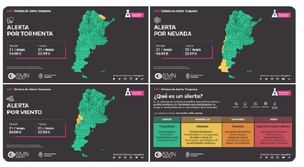 Siete provincias se encuentran bajo alerta meteorológica debido a que se esperan diferentes eventos que podrían traer inconvenientes. Por un lado, el Servicio Meteorológico Nacional advirtió acerca de nevadas intensas en las provincias del sur. Mendoza, Neuquén, Chubut, Río Negro y Santa Cruz pueden ser las más afectadas.