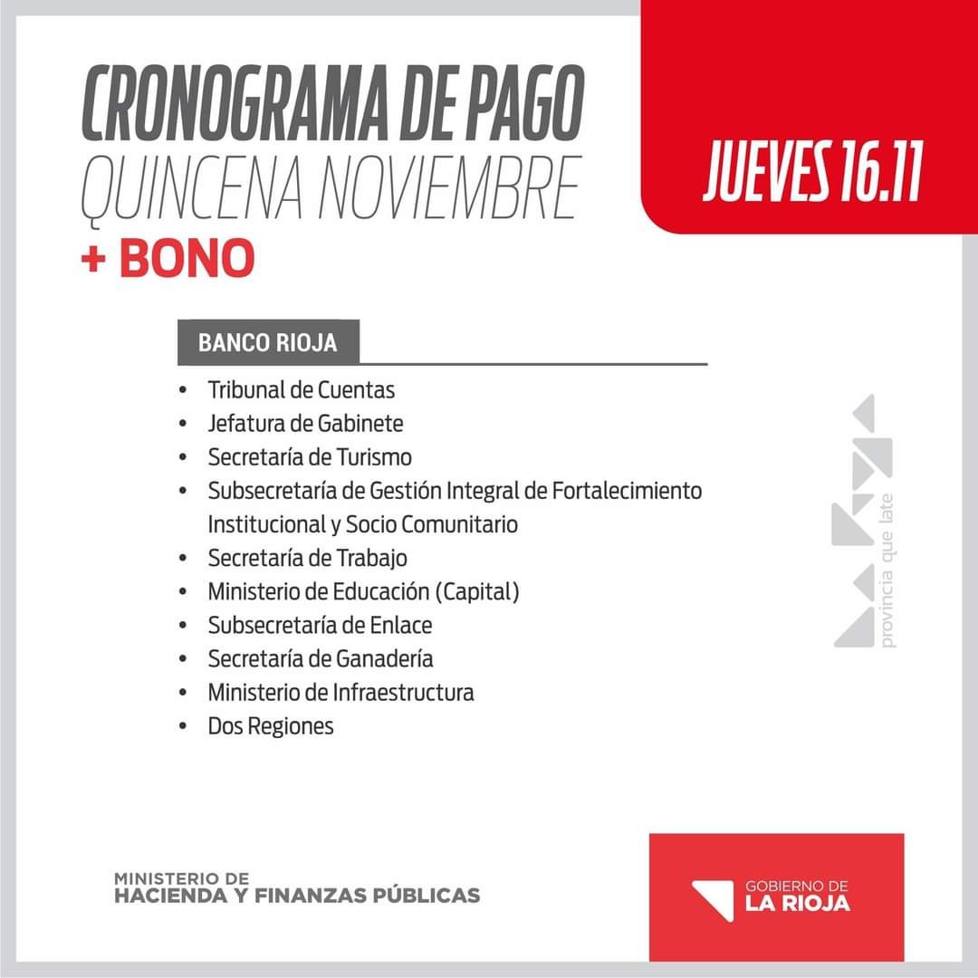 El Ministerio de Hacienda y Finanzas Públicas del Gobierno de La Rioja anunció el calendario de pagos para la quincena de noviembre, destacando la inclusión de un bono. Conocé las fechas y los sectores beneficiados.