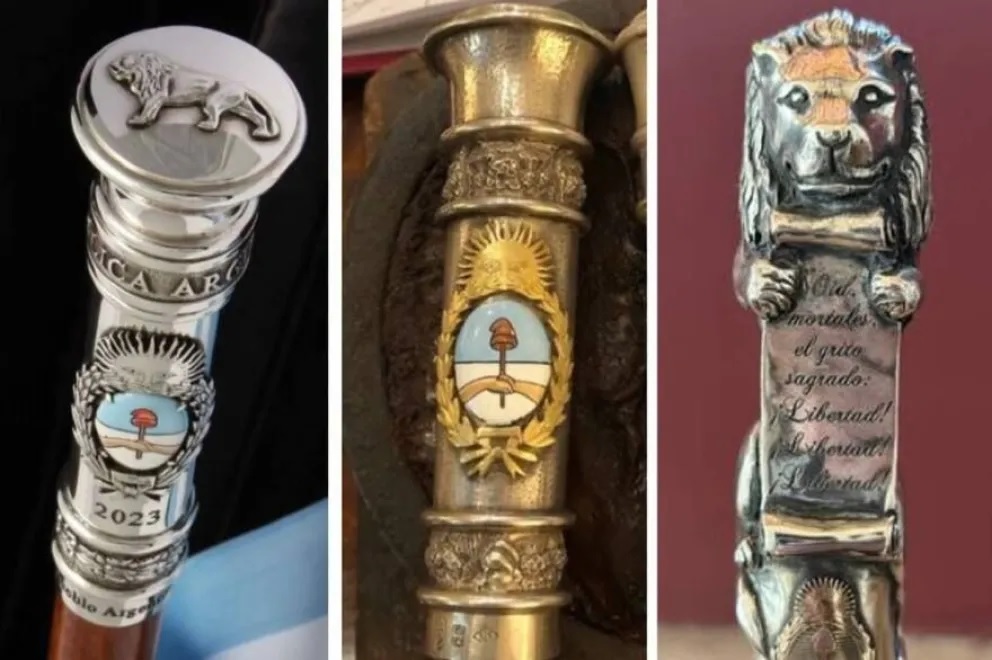 Uno de estos bastones es el ejecutado por Juan Carlos Pallarols, un maestro de la orfebrería que hizo la mayoría de los bastones presidenciales desde la llegada de la democracia, en 1983, a esta parte. Por otro lado se encuentra el que realizó Adrián Pallarols, nada menos que el hijo del primero, otro talentoso orfebre que, a modo de homenaje al presidente, incorporó en la parte superior de la pieza de mando la figura de un león, animal con el que se identifica el libertario. Y, finalmente, está el que realizó Santiago Marsili, un artesano de Santa Fe, que también le colocó al bastón la imagen de un león y los primeros versos del Himno Nacional, tal como se repite en el Himno Nacional.