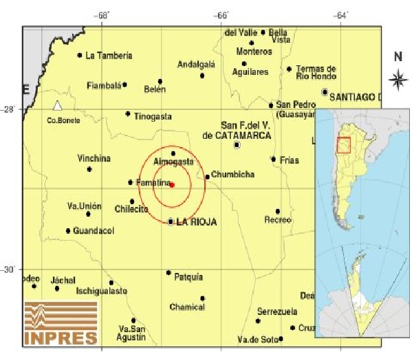 Epicentro:      51 km al N de La Rioja; 120 km al SO de San F. Del Valle De Catamarca; 44 km al S de Aimogasta -28.954 (lat) -66.825 (long)