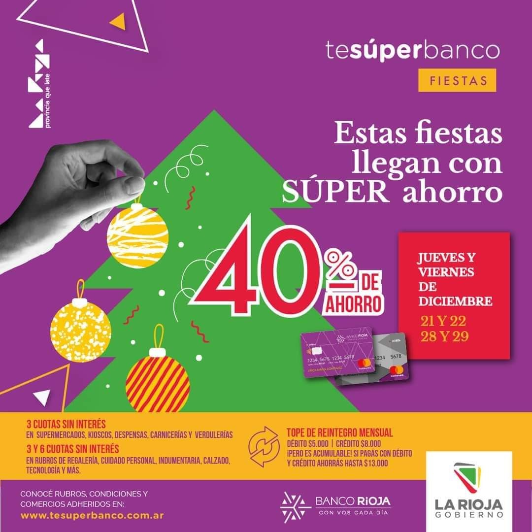 “Llegó Te Súper Banco FIESTAS! Aprovechá los beneficios exclusivos de tus tarjetas de Banco Rioja: 40% de ahorro con tu tarjeta de débito con un tope de $5.000 y 40% de ahorro con tu tarjeta de crédito Mastercard BR más cuotas sin interés y con un tope de reintegro de $8.000. Hacé tus compras con descuento en los comercios adheridos”, así indicaron desde Banco Rioja sobre esta nueva promoción.