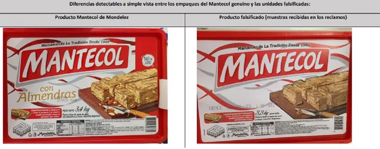 Además, el etiquetado del producto falso carece de información esencial como un fechador de vencimiento, mientras que el Mantecol auténtico presenta un código de lote y una fecha de vencimiento impresa con tinta inkjet y una vida útil de un año, a diferencia del falso que muestra una fecha de elaboración y vencimiento indicando casi cinco años de vigencia.