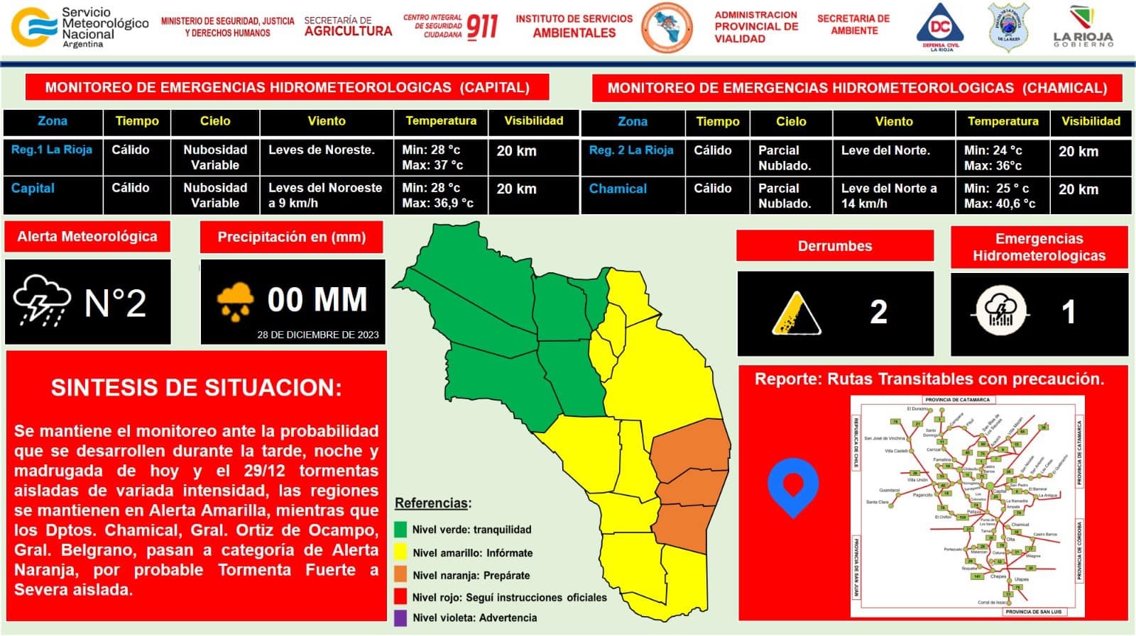 *Capital*. *Arauco*. *Castro Barros*. *Sanagasta*. *Gral. Juan F. Quiroga*. *Gral. San Martin*. *Rosario V. Peñaloza*. ⚠️ Se espera que durante la Tarde, Noche del día 28, las zonas delimitadas sean afectadas por *Tormentas Eléctricas Aisladas* , las cuales podrían desarrollarse con intensidad de moderada a fuerte. *Fase: Alerta NARANJA* Los siguientes Dptos: *Chamical* . *Gral. Belgrano.* *Gral. Ortiz de Ocampo.* Se encuentran en *Alerta NARANJA* , por probable tormenta con característica de Fuerte a Severa. 🚨 ⛈️ Las mismas podrían estar acompañadas por ráfagas de viento, importante actividad eléctrica, sectorizada precipitación, ocasional caída de granizo. ⚠️ ⛈️ Los eventos pueden generar condiciones de riesgo en determinados lugares. ⚠️ Se recomienda tomar precauciones preventivas. *Fuente:* Servicio Meteorológico Nacional. *Área:* Irepcysa, S.I.A.T Se continúa con el monitoreo regional de la situación desde el S.I.A.T y SMN La Rioja.